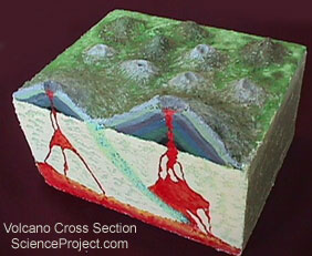 as gas, ash, and lava, a magma chamber, alternating layers of