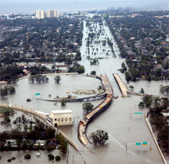 In the last days of August 2005 a category 5 tropical store named hurricane Katrina moved inland in the Mississippi area.  Its storm surge soon breached the levee system that protected New Orleans from Lake Pontchartrain and the Mississippi River.